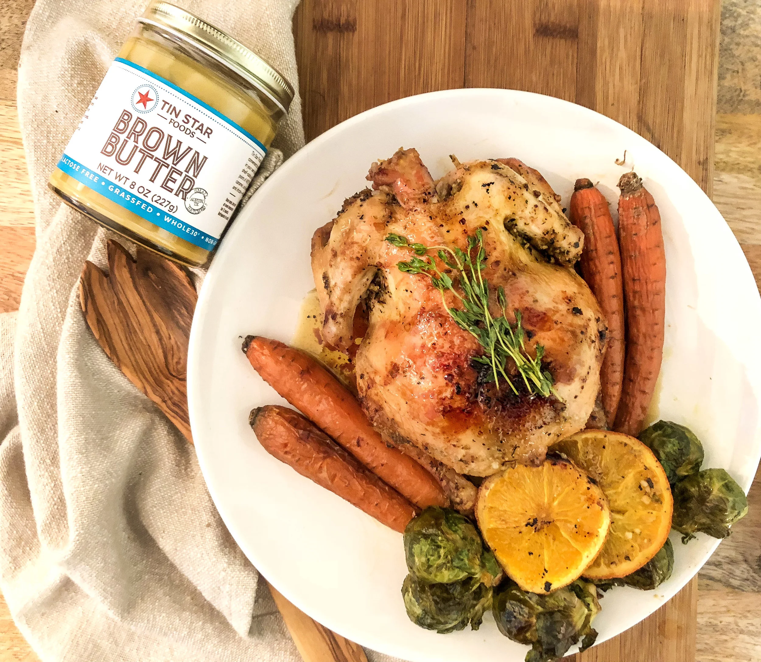 inside of the chicken, place ½ organic, fresh thyme and 1 tablespoon brown butter ghee.