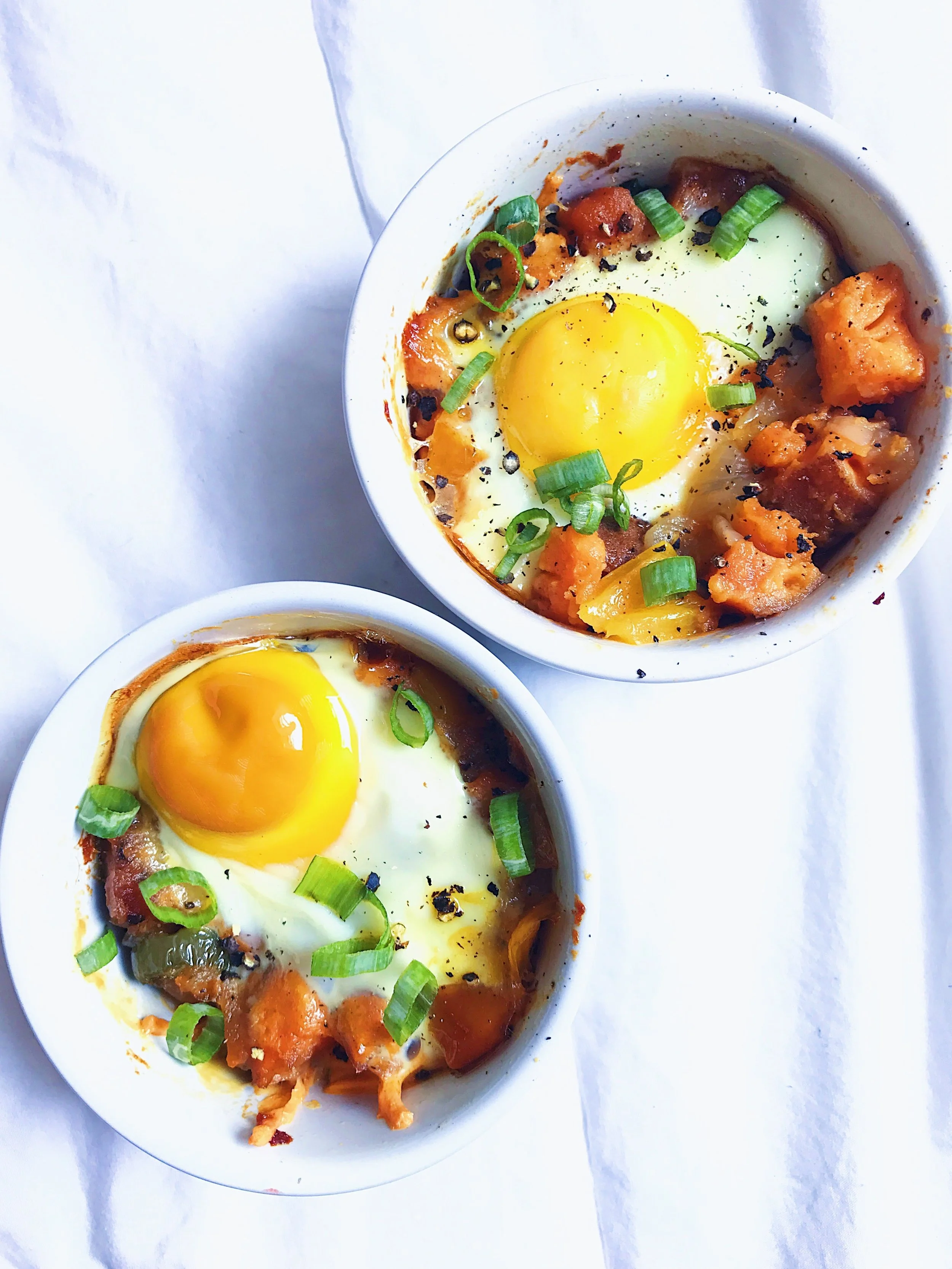 transfer cooked sweet potato hash into individual ramekins [ or leave in pan]⠀